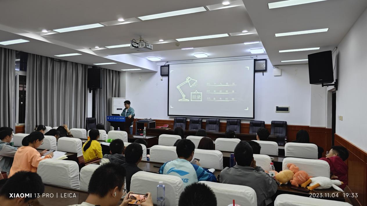 廖倍就个人情况、考前准备、备考经验三个部分展开分享。其中考前准备提到了择校、确定备考硕士类型、确定备考书籍、考研重要时间点四个方面,并以自身经历给同学们分享相关课程、书籍等等。在分享备考经验时,廖倍提醒同学们不论是否参加考研,都需要对大学四年时间早规划,早准备。最后提到在备考过程中劳逸结合,张弛有度,与志同道合的朋友结伴而行。