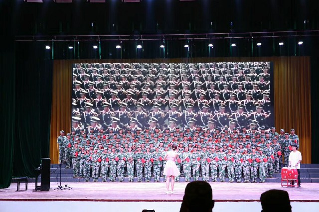 合唱团的同学们在军训期间,利用午间及晚间休息时间加时加训,历经十几天的紧张准备排练,在舞台上用歌声传承爱国精神、唱响青春旋律,表达了新时代青年学子对祖国的讴歌与热爱,深情悠扬的歌声,配合钢琴和鼓手跳动音符,手中挥舞的五星红旗,在这个美丽的夜晚深深打动着每一位评委和在场观众的心。