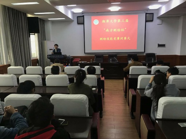 2018年4月14日上午,我校第三届“南方测绘杯”测绘技能竞赛在体育馆正式开幕。本届测绘技能大赛裁判团由土木工程与力学学院刘正才、叶险峰、黄登山、吴湘平等老师组成。湘潭南方测绘集团总经理寻林辉、学院党委副书记欧阳巍及测绘系系主任刘正才出席开幕式。