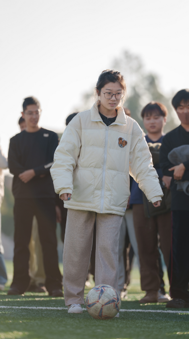 足球保龄球项目充满悬念。在该项目中,队员们需要通过踢足球去击打远处的“保龄球瓶”,击倒数量最多的队伍取得本项目的胜利。
