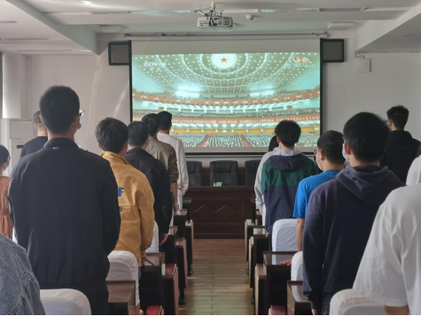 “全体起立,奏唱国歌!”在院楼A217报告厅集中观看党的二十大开幕会的党员代表们跟随直播画面,肃然起立,伴随着国歌激昂的旋律,用洪亮而饱满的声音唱响国歌,感受着团结、奋进的时代脉搏。